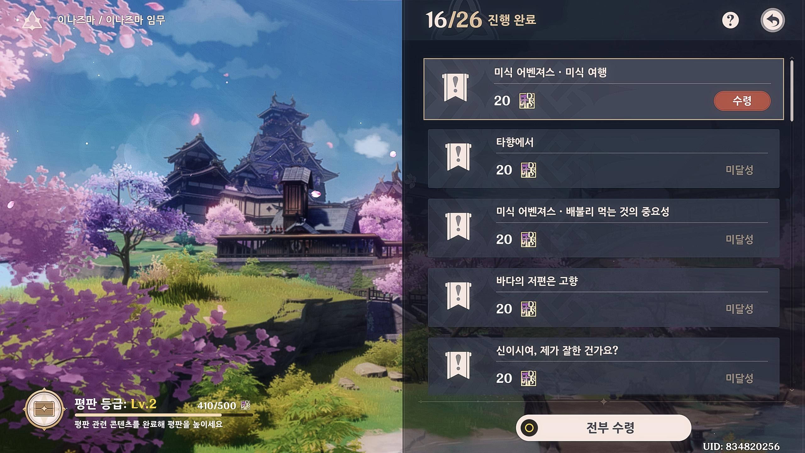 7. 평판 임무 / 이나즈마 입무 퀘스트 완료가 됩니다 ^-^