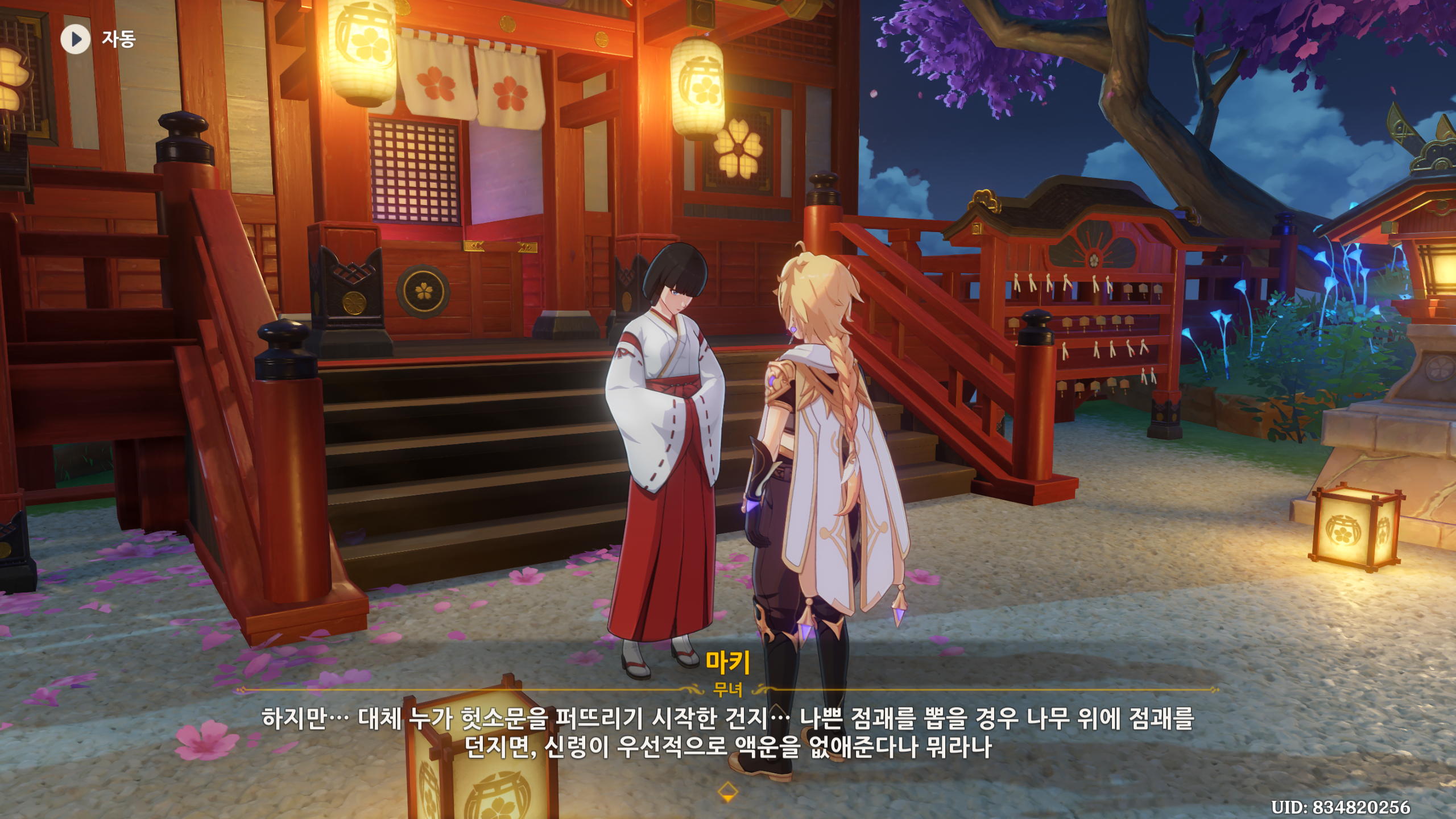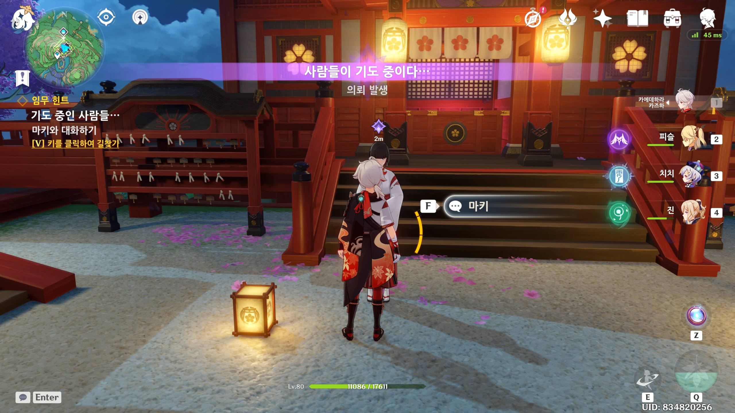 퀘스트 부여 받은 후 나루카미 다이샤의 마키에게 대화를 진행합니다.