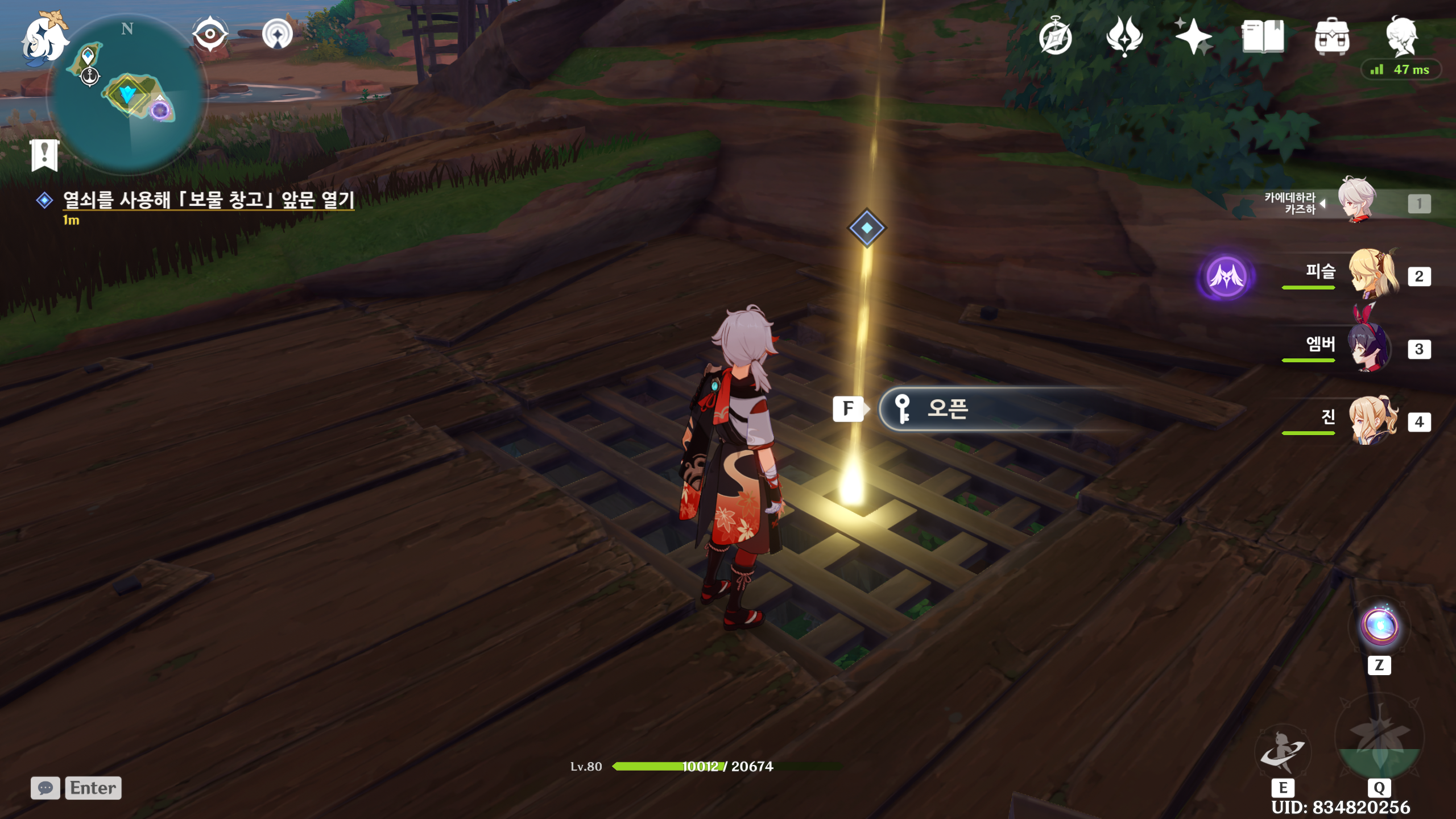 퀘스트 시작위치 이곳에서 너구리같은 여우에게 렌즈를 비추면 퀘스트가 시작된다. 그럼 큰 여우상이 나타나고 번개원소로 명중하면 주술 도구를 얻을 수 있다. 2. 번개 원소로 공격하면 열쇠모